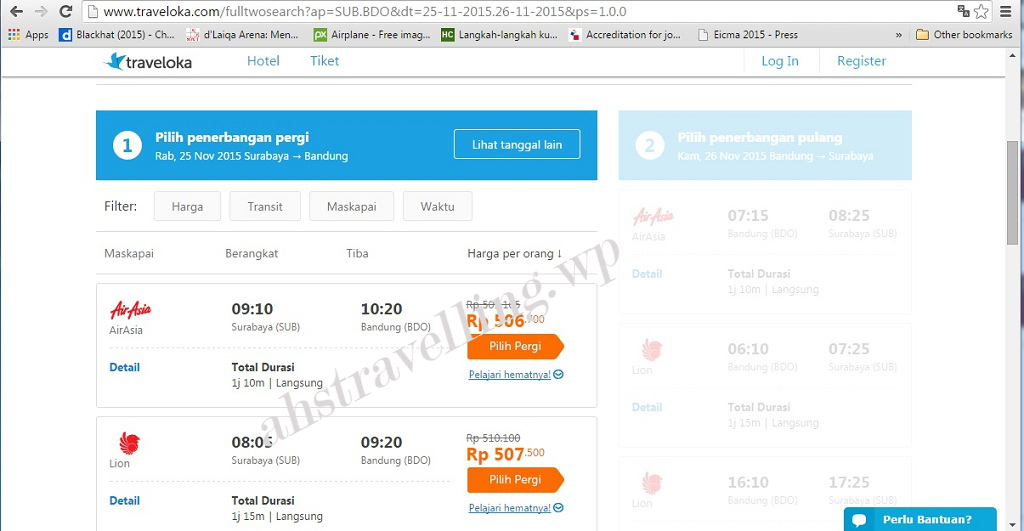 Ahs Travelling coba mencari penerbangan dari Surabaya ke Bandung. Terlihat wego lebih responsif dengan menampilkan semua penerbangan yang tersedia hanya dalam tempo sekitar 20 detik. Sedangkan traveloka menampilkan hasil pencarian dengan waktu yang lebih lama, sekitar 30 detik, & hasil pencarian yang tidak sebanyak & selengkap wego. Selain itu wego juga menyertakan informasi total hasil pencarian, traveloka tidak. Lihat gambar di bawah
