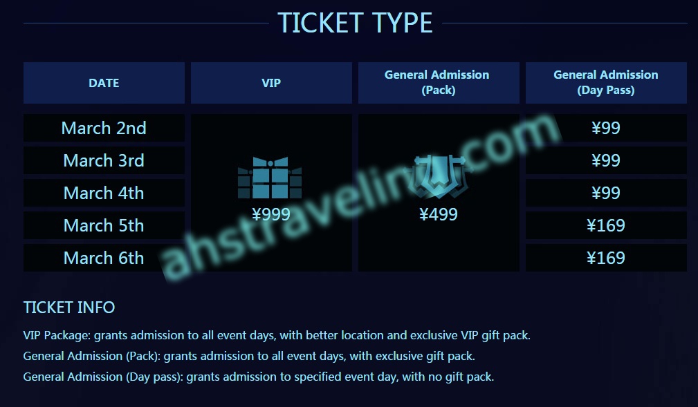 Tiket ada 3 tipe. Ada tiket VIP, Terusan & tiket harian. Tiket VIP dijual seharga 999RMB, sedangkan tiket non vip terusan dihargai 499RMB. Kalau didollarkan sekitar 151USD utk VIP & 75USD utk tiket terusan.