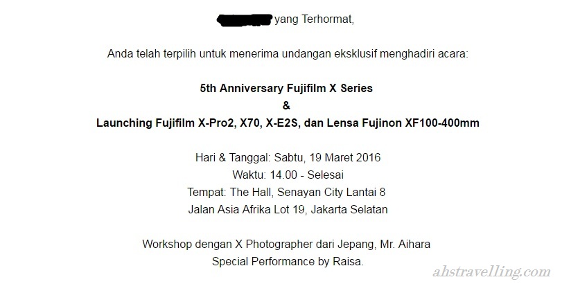 Saat di open ternyata surel mengenai sebuah undangan untuk menghadiri acara perayaan 5 tahun FujiFilm X series & launching produk digital camera baru
