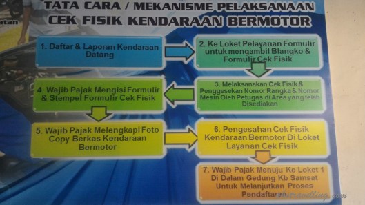 Jadi kalau di samsat ane (dan spt nya di samsat lain juga spt itu, sudah SOP), begitu dateng langsung parkir kendaraan di tempat cek fisik. Lalu lanjutkan langkahmu sesuai flowchart terlampir. Tercatat urusan kelar gak lebih dari 1 jam 15 menit.